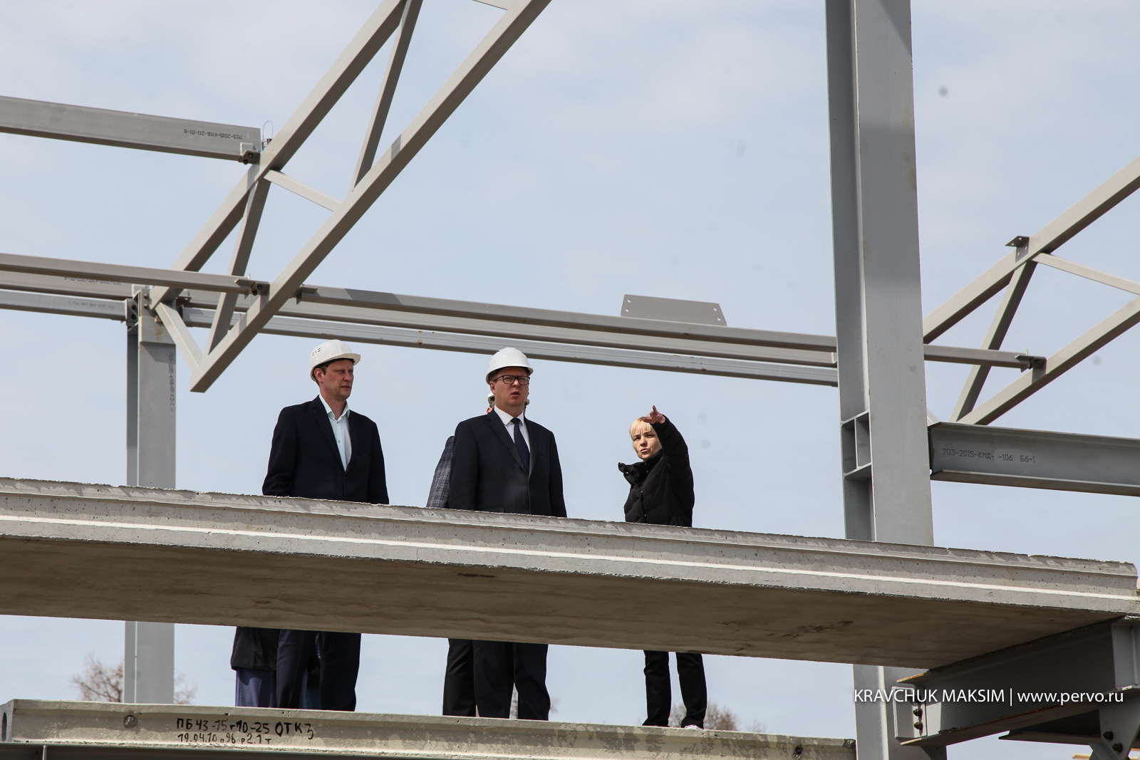 Глава осмотрел фундамент, металлические конструкции кровли и ограждения из железобетона. Затем поднялся на второй этаж, перекрытия которого уже частично смонтированы.