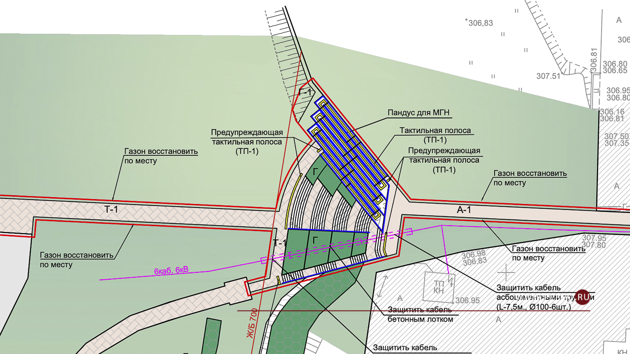 Подрядчику предстоит сделать большой лестничный спуск, в котором также предусмотрен пандус для маломобильных групп населения.