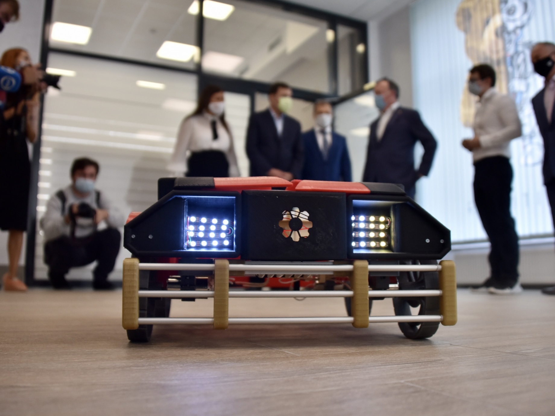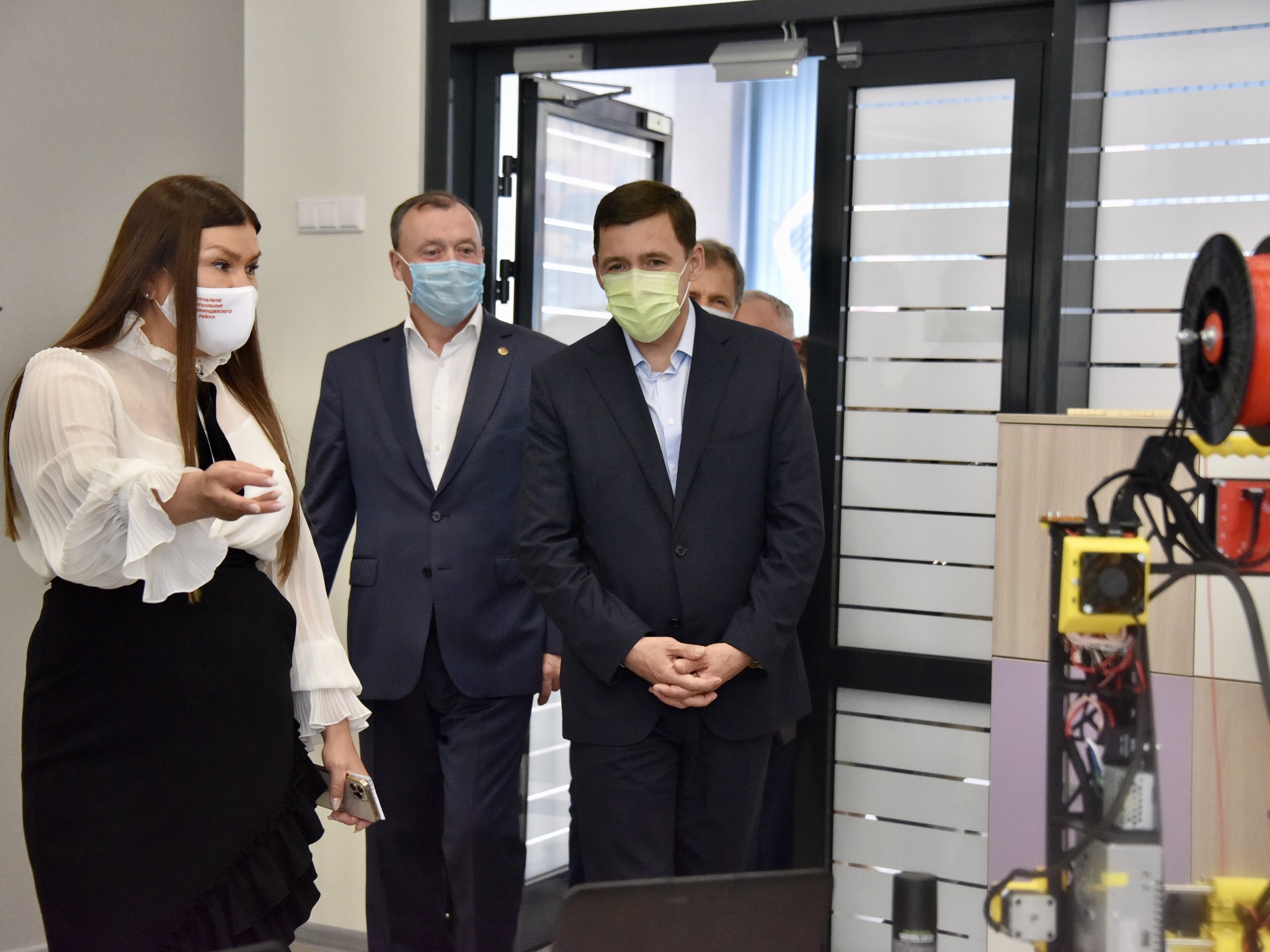 Евгению Куйвашеву и Алексею Орлову показали оборудованные кабинеты и игровые для младших школьников, новые классы и мастерские. В учебном заведении располагается два спортивных зала, библиотека, столовая, актовый зал, медицинский блок, а также профильный инженерно-технологический класс с лабораторией по изучению аналоговой и цифровой электроники, программирования электронных устройств, микропроцессоров. Здесь же есть лаборатория 3D-моделирования и прототипирования, а также робототехнические наборы.