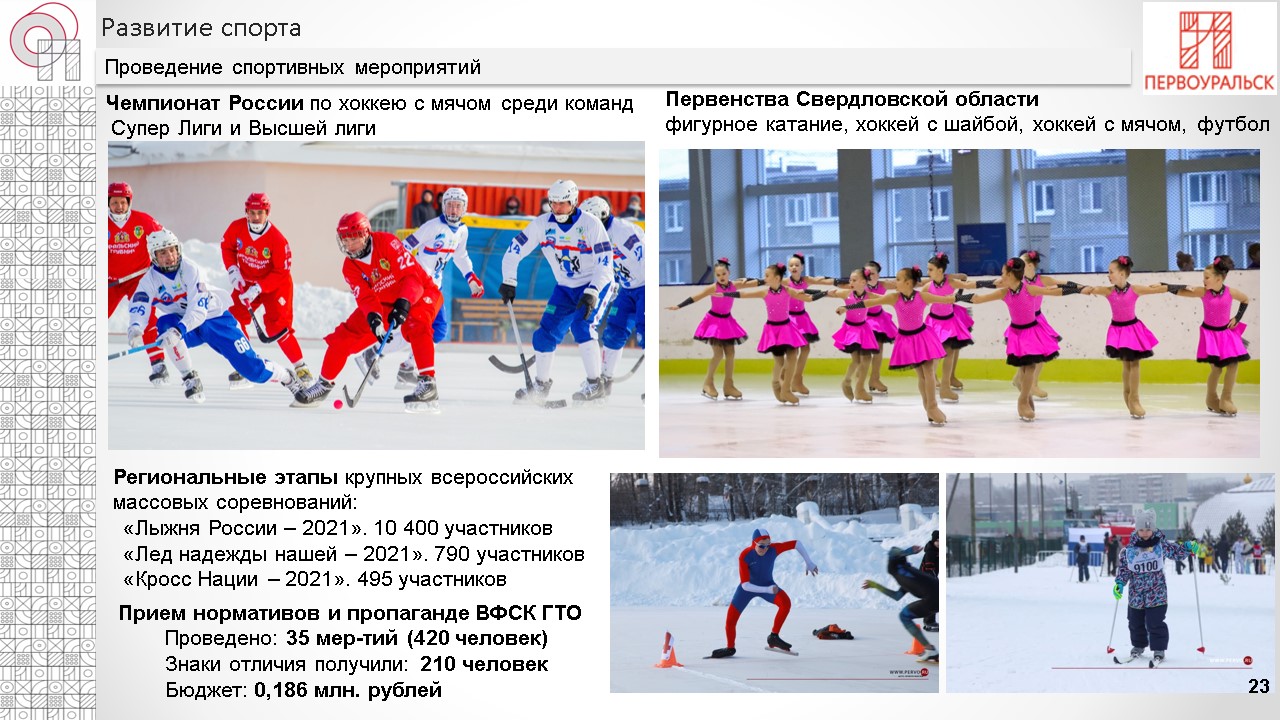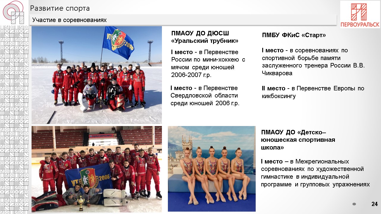 Также в Первоуральске создаются все необходимые условия для обеспечения доступности дополнительного образования детей, реализации программ допобразования по различным направлениям, для развития физической культуры и массового спорта, организации и проведения физкультурно-оздоровительных и спортивных мероприятий.