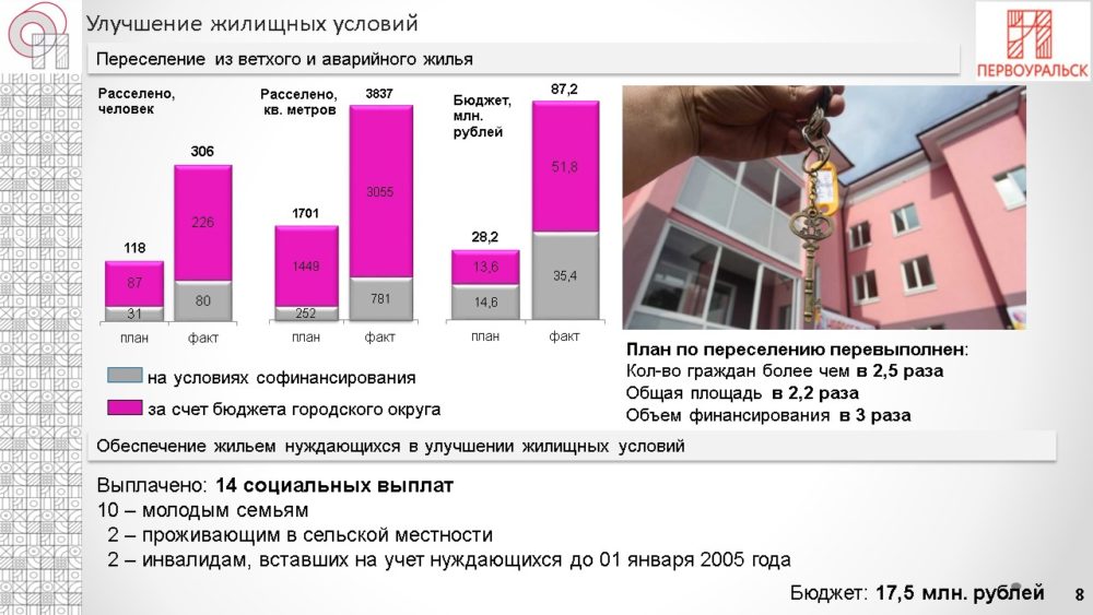 Переселение жителей городского округа Первоуральск из ветхого и аварийного жилья идет опережающими темпами. Всего в отчетном периоде расселено 306 человек из почти 4000 кв. м аварийного жилья. Объем средств, направленных на эти цели, превысил 87 млн рублей. Таким образом, план по переселению жителей из ветхого и аварийного жилья в 2021 году перевыполнен более чем в 2 раза, а объем финансирования увеличен в 3 раза.