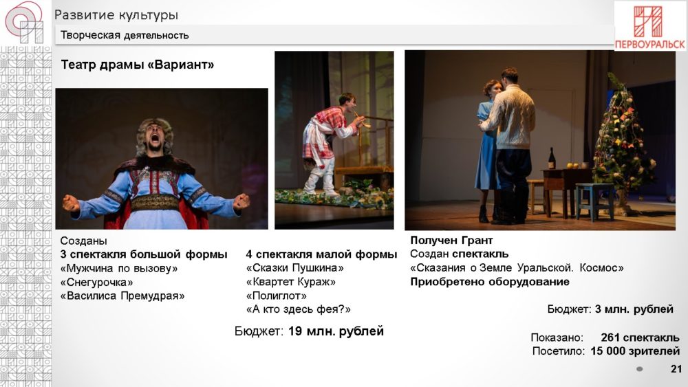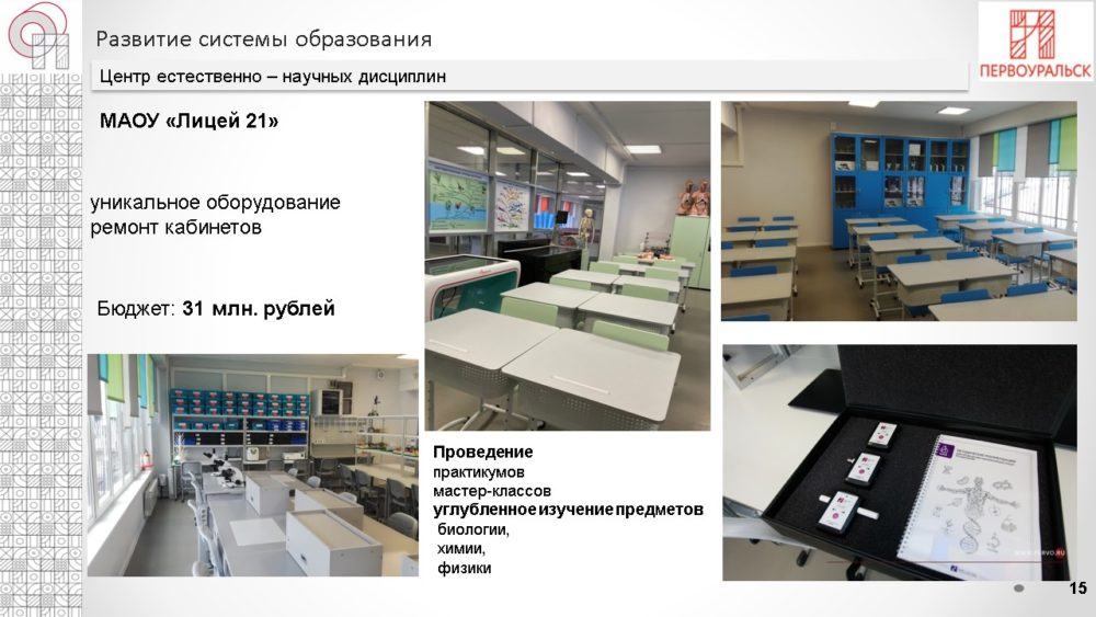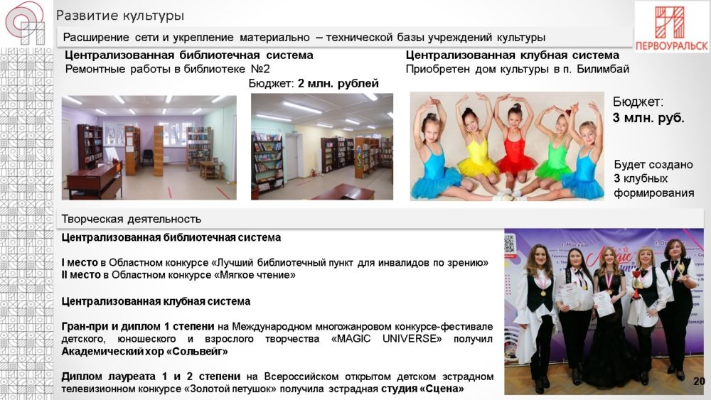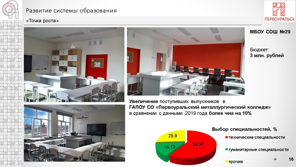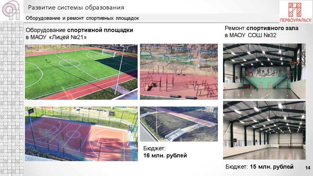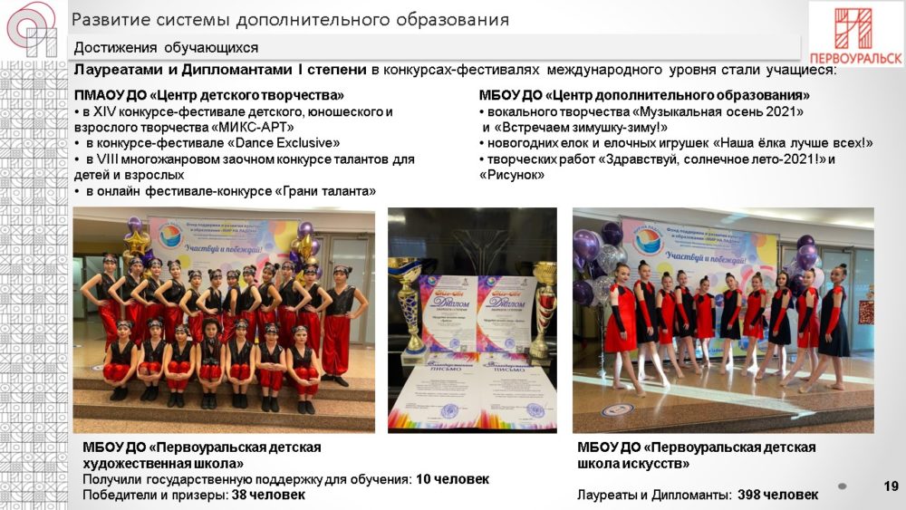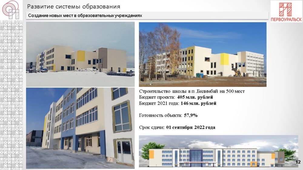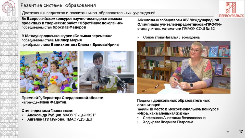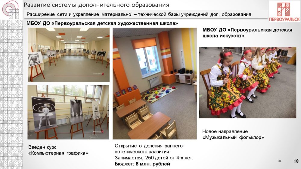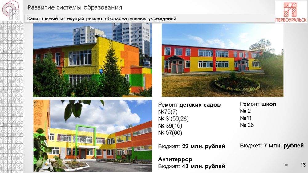 Подробнее о создании новых мест в образовательных учреждениях, о капитальных и текущих ремонтах школ и детских садов, расширении материально-технической базы учреждений культуры, спорта и дополнительного образования, о достижениях первоуральских педагогов и их воспитанников – в презентации: