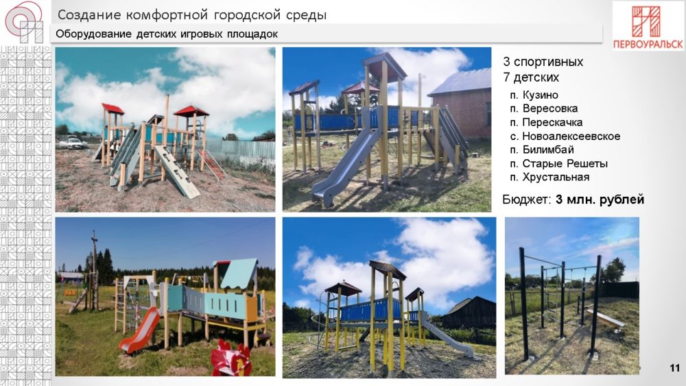 В сельских населенных пунктах продолжаются работы по благоустройству дворовых территорий. В 2021 году в поселках Кузино, Вересовка, Перескачка, Билимбай, Старые Решеты, Хрустальная и в селе Новоалексеевское установлено три спортивных и семь детских игровых комплекса. Стоимость работ превысила 3 млн рублей.