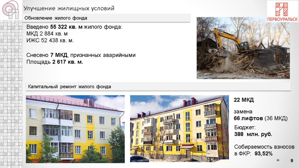 С целью предотвращения увеличения жилья, признаваемого ветхим и аварийным, ежегодно проводится капитальный ремонт многоквартирных домов. В 2021 году капремонт выполнен на 388 млн рублей в 22-х МКД, в которых заменены общедомовые инженерные системы тепло-, электро-, водоснабжения и водоотведения и произведен ремонт кровли и фасадов зданий. В 36 многоквартирных домах заменено 66 лифтов, отработавших назначенный срок службы 25 лет.