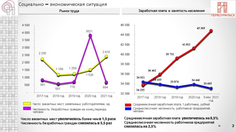 Количество вакантных мест на рынке труда городского округа в 2021 году увеличилось более чем в 1,5 раза. Численность безработных граждан снизилась в 5,5 раз. Среднемесячная заработная плата выросла на 8,5%.