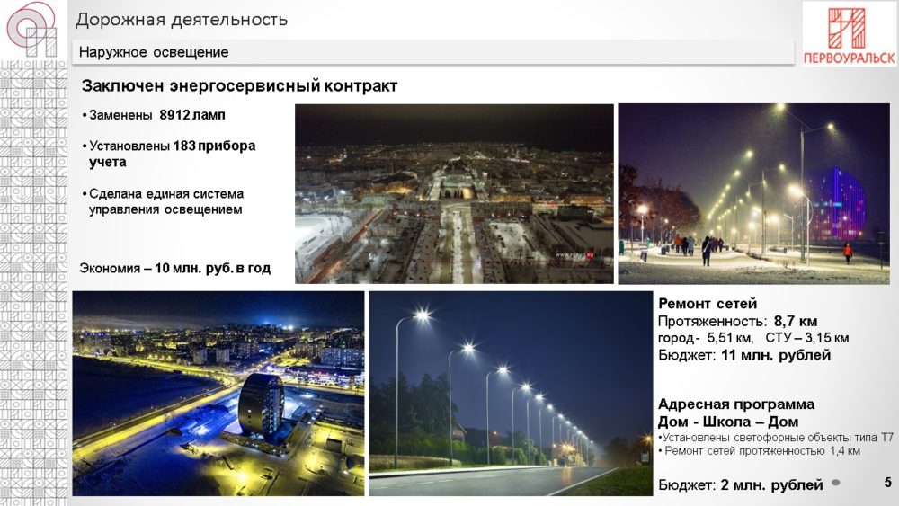 В отчетном году заключен энергосервисный контракт на модернизацию наружного освещения. По условиям контракта 9000 уличных светильников заменены энергосберегающими, установлено 183 прибора учета и внедрена единая система управления освещением. Данные мероприятия позволят снизить потребление электроэнергии на цели уличного освещения не менее чем на 70% и дадут экономию расходов на электроэнергию не менее 10 млн рублей в год.