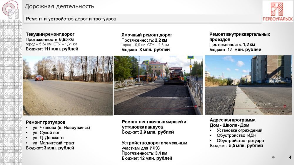 С целью обеспечения безопасного движения транспортных средств выполнены работы по ремонту 10 км автомобильных дорог в городе и сельских населенных пунктах. На текущий ремонт дорог направлено 111 млн руб., на ямочный – 8 млн руб., на ремонт внутриквартальных проездов потрачено 17 млн руб.