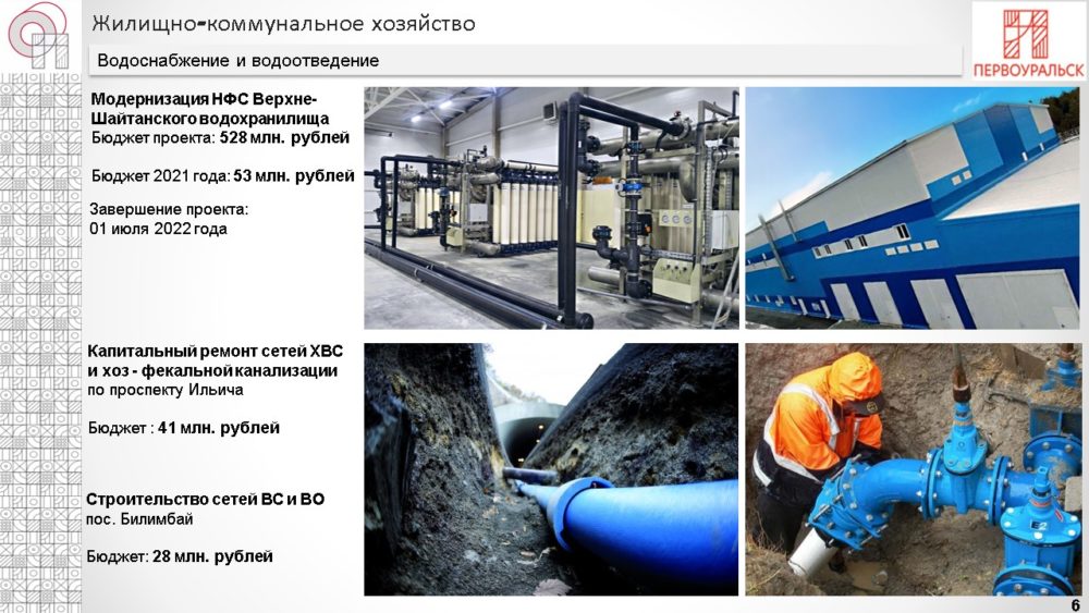 В числе значимых изменений, которые произошли в сфере ЖКХ городского округа в 2021 году, Глава отметил завершение работ первых трех этапов модернизации насосно-фильтровальной станции Верхне-Шайтанского водохранилища. В рамках модернизации НФС построено здание ультрафильтрации со складскими помещениями и реагентным хозяйством, завершено строительство резервуара чистой воды объемом 3200 куб. м, выполнен монтаж модулей ультрафильтрации. Окончание реализации проекта и ввод объекта в эксплуатацию запланированы на июль 2022 года.