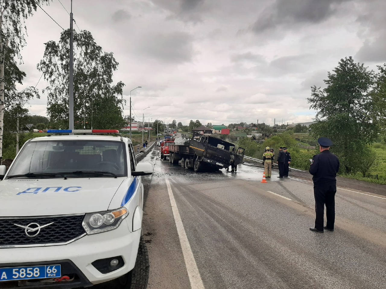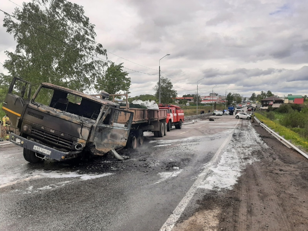 Предварительно сотрудниками ГИБДД установлено, что 8 июня в 12.30 часов дня на 5 км подъездной автодороге к г.Первоуральску водитель 2002г.р., управляя автомашиной «Опель Астра» двигаясь со стороны автодороги Пермь-Екатеринбург допустил выезд на полосу дороги, предназначенную для встречного движения, где допустил столкновение с грузовой автомашиной «КАМАЗ», двигающейся во встречном направлении со стороны ул. Сакко и Ванцетти под управлением водителя 1982г.р. От столкновения произошло возгорание автомашины «КАМАЗ».