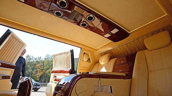 Первым делом Forbes отмечает, что, в отличие от зарубежных автомобилей, у ЗИЛа раскрываются средние двери, открывающие свободный доступ в салон типа пульман - где сиденья установлены навстречу друг другу. Внутри обратил на себя внимание встроенный в подлокотник холодильник, раздельный климат-контроль для левой и правой частей салона, а также большая выдвижная ТВ-панель, "на которой можно посмотреть Первый канал". Видно, как эффектно раскладываются передние кресла салона.
