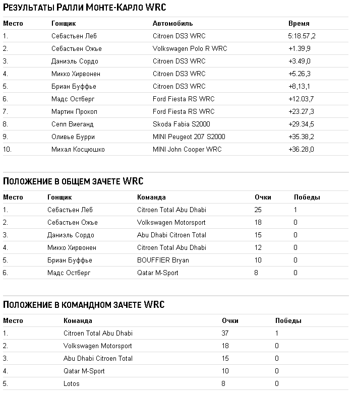 Пилот Citroen Себастьен Леб выиграл Ралли Монте-Карло, первый этап нового сезона WRC. Для девятикратного чемпиона мира это седьмая победа в знаменитой гонке. Следом за ним финишировали Себастьен Ожье из Volkswagen и еще один гонщик Citroen Даниэль Сордо. Россиянин Евгений Новиков сошел с дистанции.