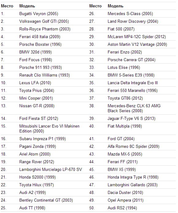 Британское издание Top Gear составило список 50 лучших автомобилей, вышедших за последние 20 лет. Итоговый рейтинг, который по итогам онлайн-опроса помогли составить около 100 тысяч читателей, будет опубликован в специальном выпуске журнала, посвященном его 20-летию.