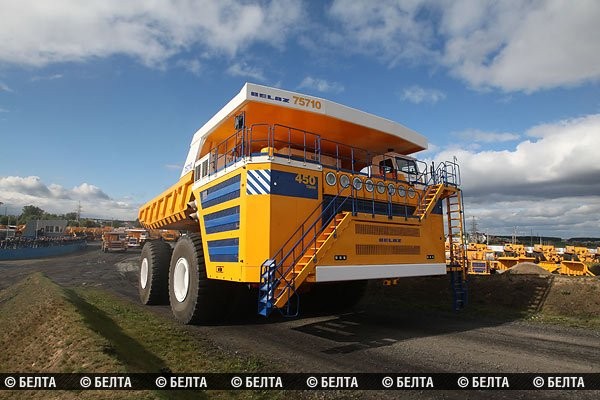 Напомним, БелАЗ-75710 был представлен в сентябре 2013 года. В длину этот автомобиль достигает 20 метров, в ширину — 9,7 метра, в высоту — больше 8 метров. Общая масса машины составляет 810 тонн. Она имеет 8 колес и сразу два дизельных 65-литровых двигателя суммарной мощностью 4651 лошадиная сила. Двигатели приводят в движение генераторы, которые питают установленные на каждое колесо тяговые электромоторы по 1200 кВт каждый. Максимальная скорость автомобиля — 64 км/ч.