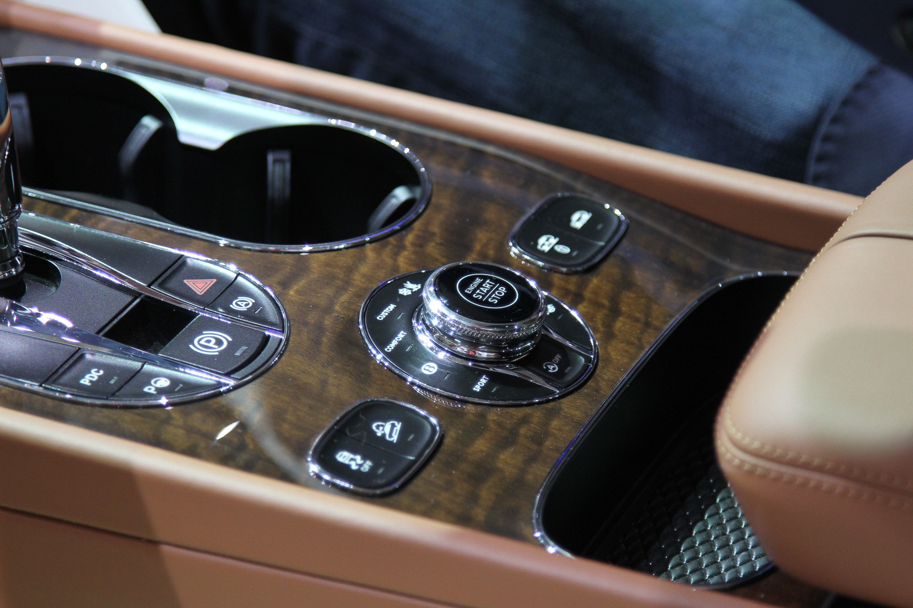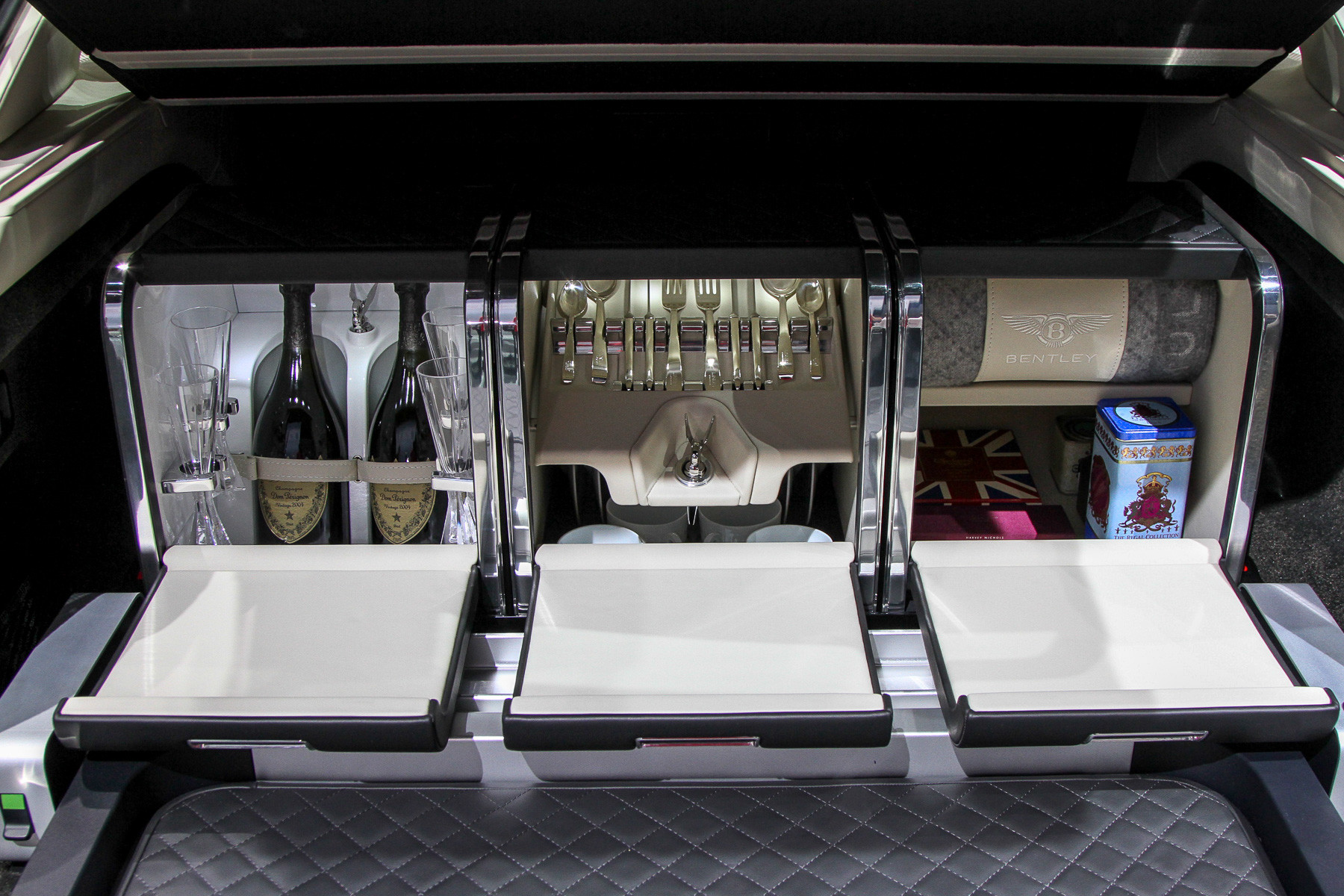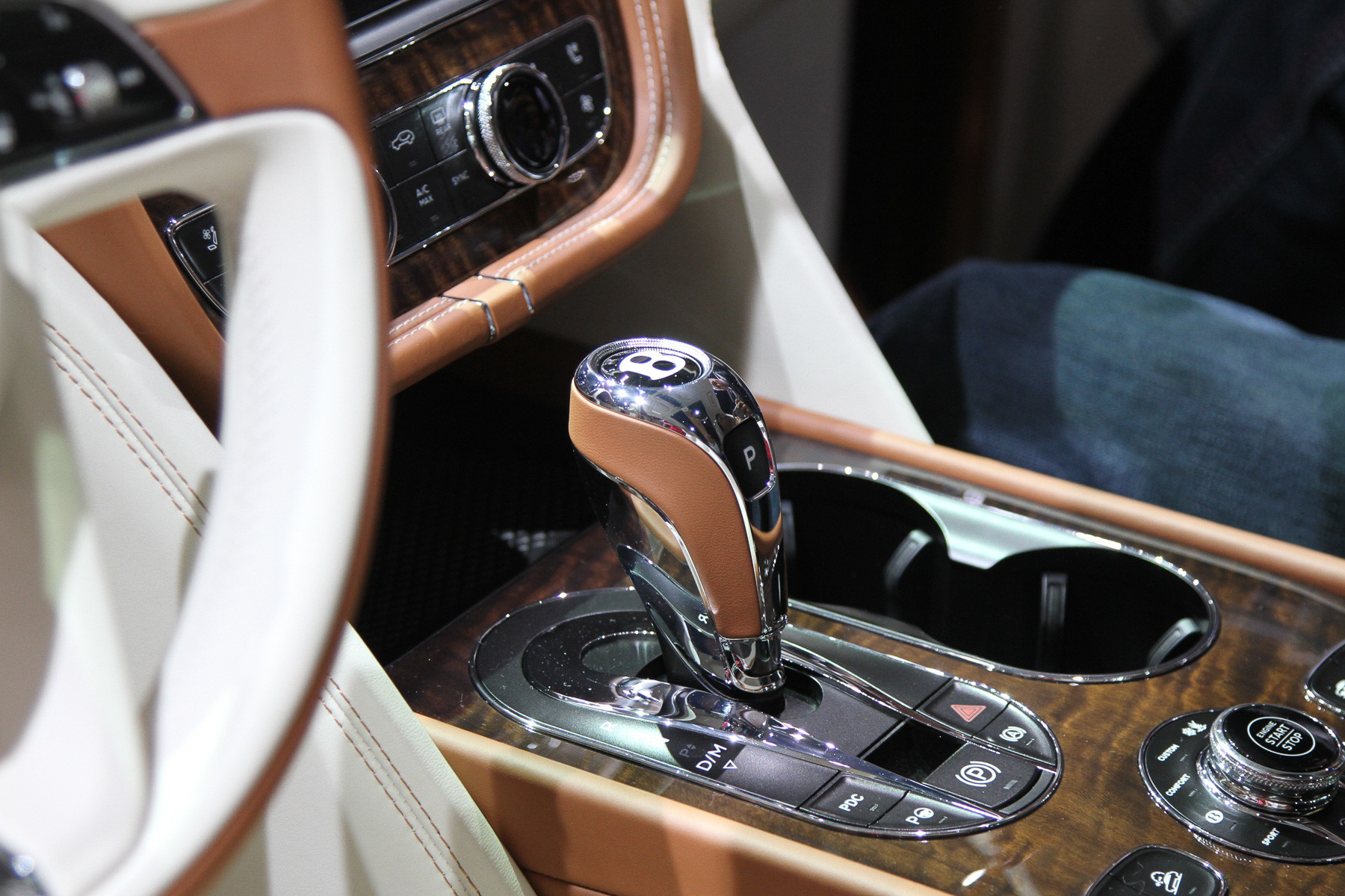 Да, здесь весь багажник занят набором для пикника с шампанским и чайным сервизом, задние раздельные кресла (может быть и сплошной ряд) — с полным набором электрорегулировок, неприкрытого пластика почти нет: кругом дерево и кожа, которой обёрнуты даже нижние части дверей. В общем, обстановка консервативного английского кабинета. Но тот же длиннобазный Range Rover может быть отделан ничуть не хуже! К тому же у «Бентайги» кое-где торчат аудюшные «уши» — унифицированные кнопки, рычажки, мультимедиа... Большинство клиентов этого даже не заметит, но если вы вдруг решите поменять свой Q7 на Bentley... Может быть, вращающиеся часы компенсируют? Забавная, кстати, штука.