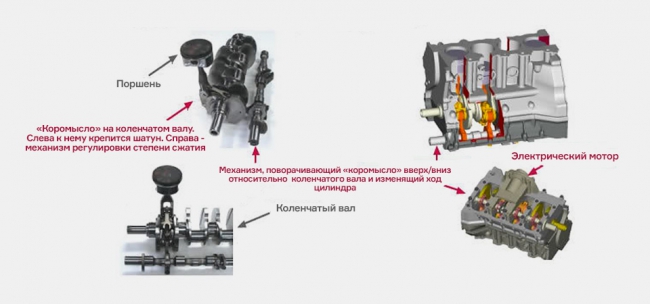 Новый двигатель Nissan получил коленчатый вал, на который надето своего рода коромысло. Слева к нему крепится шатун, справа — рычаг, управляемый электромотором. Движение рычага меняет положение шатуна относительно коленчатого вала и физически изменяет степень сжатия.