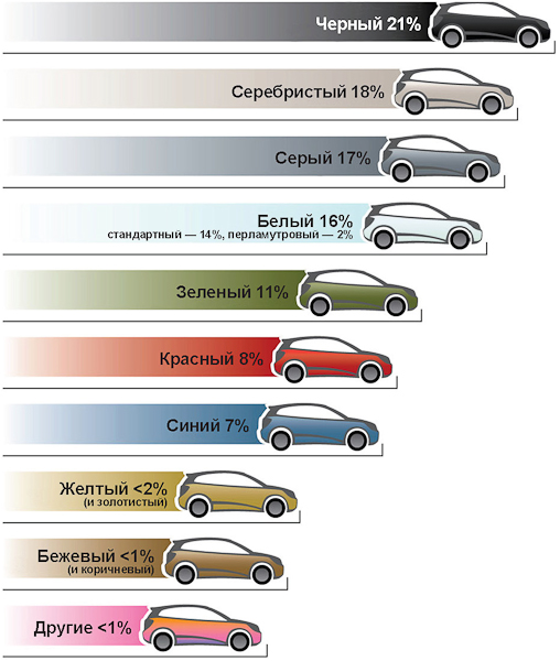 Самым популярным цветом машин в 2011 году стал… белый. Сразу 21% автомобилей, проданных в этом году в мире, было покрашено белым лаком. Ранее одиннадцать лет подряд (!) на первом месте был серебристый. Однако в 2011 году серебристый цвет занял лишь второе место – около 20% машин имели такую окраску. Примерно такой же процент у черного.