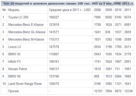 Россияне все чаще покупают дорогие автомобили! Продажи моделей стоимостью свыше 100 тыс. долларов в России за 9 месяцев 2011 года превысили показатель аналогичного периода докризисного 2008 года сразу на 11% (продажи «обычных» машин при этом не дотягивают до докризисного показателя еще 15%). Если в 2008 году было куплено около 40 тыс. подобных машин, то в 2011 году речь идет уже о 44,1 тыс.