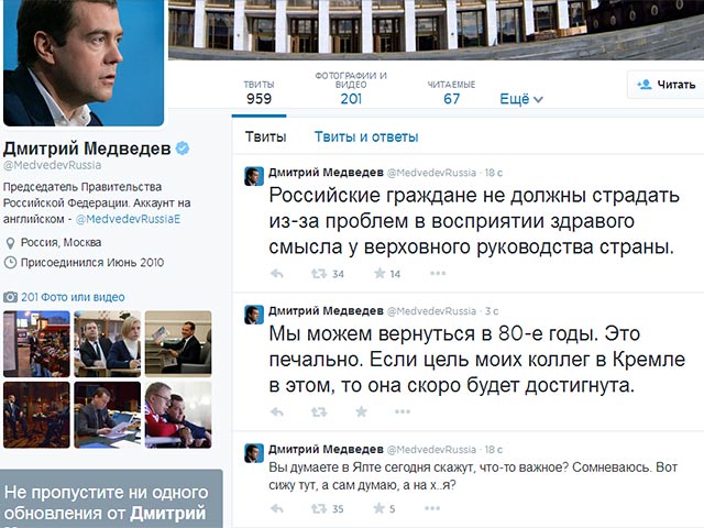 "Вы думаете в Ялте сегодня скажут, что-то важное?" - задался вопросом по этому поводу мнимый Медведев в Twitter. И сам же ответил на него: "Сомневаюсь".