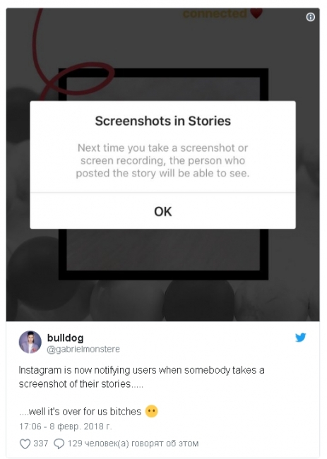 Также Instagram предупреждает пользователей о том, что скриншот теперь нельзя сделать втайне. Это предупреждение появляется только один раз: