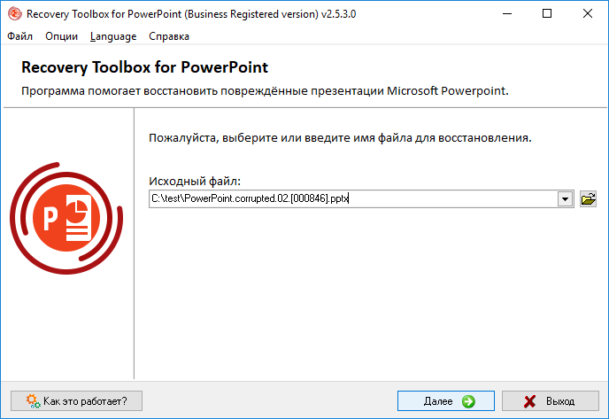 Установить и запустить Recovery Toolbox for PowerPoint.