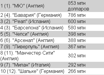 При составлении рейтинга учитывались различные источники доходов клуба, в том числе - продажа билетов на матчи, спонсорские контракты, продажа сувенирной продукции и прав на телевизионные трансляции игр.