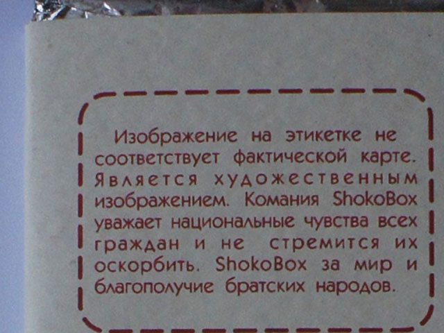 Путешественник был крайне удивлен, когда увидел, что на упаковке изображены не только нынешние границы России, но и "перспективные": красными штрихами закрашены Финляндия, а также другие страны Европы, почти вся Азия и Аляска. Судя по обозначениям, все они должны войти в состав РФ. "Там было много различных видов подарочного шоколада, но все остальные были обычными", - написал финн. По его мнению, забавно, что в таком известном месте продается шоколад с провокационной упаковкой.
