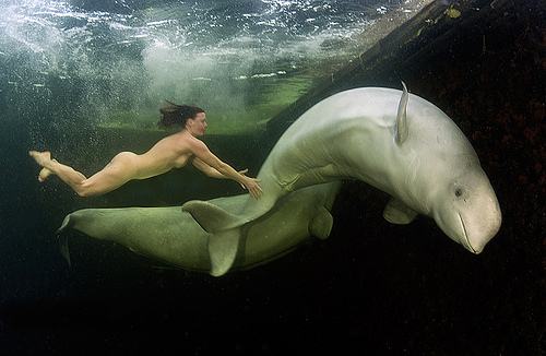 Белухи отличаются от других морских животных тем, что их морды, подобно мордам дельфинов, могут передавать различные сложные эмоции, свойственные человеку. По виду двух белух было видно, что им нравится резвиться с Натальей, они как будто радостно улыбались спортсменке.