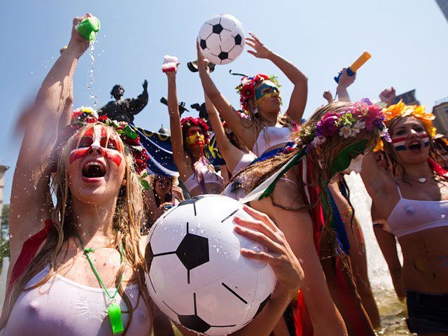 Девушки, одевшись в плавки и белые топики, разрисовали лица и тела в цвета национальных флагов футбольных сборных, которые могут принимать участие в матчах финальной части Чемпионат Европы 2012 года по футболу, который пройдет на Украине и в Польше.