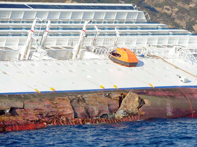 Исполинский лайнер Costa Concordia длиной 290 м лег на дно на правый бок. На левом боку судна, который торчит из воды, отчетливо видна рваная часть корпуса, пострадавшего, когда, судя по всему, судно наскочило на каменный риф.