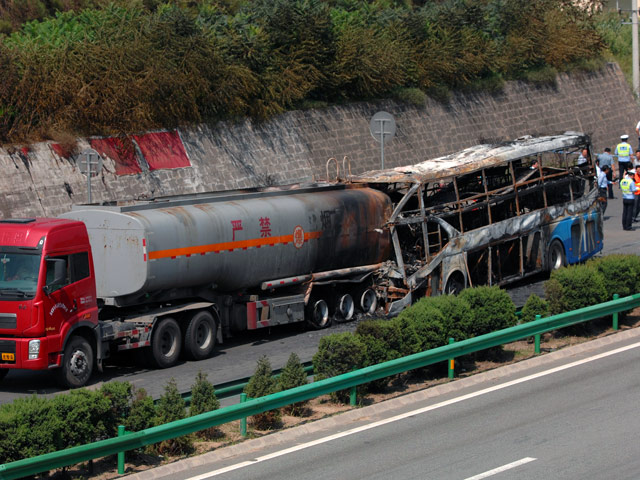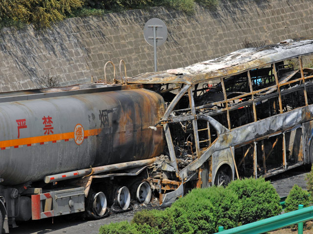 В Китае жертвами автокатастрофы стали 36 человек: автобус столкнулся с цистерной, отчего оба транспортных средства загорелись. Выжить удалось лишь троим пассажирам автобуса.