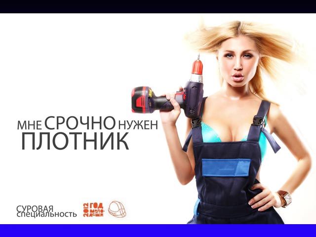 В Коми в рамках кампании "Суровая специальность" местные власти объявили конкурс по разработке проекта агитки в поддержку рабочего движения. На плакатах, которые в итоге должны украсить улицы Ухты, изображены погрязшие в быту большегрудые красотки, заявляющие, что им "Срочно нужен слесарь (сантехник, сварщик)". Примеры работ, пока выставленных на суд общественности, публикует "Ухта 24". По окончании проекта их заменят на новые с надписями: "Нашла настоящего мужчину".
