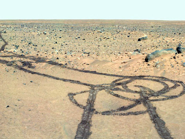 "На самом деле все более прозаично", - пишет Space.com, раскрывая наиболее правдоподобную версию. Так как фото было сделано в марте 2004 года и подпись под ним гласит "следы ровера", то скорее всего, рисунок - это след колес марсохода Spirit, контакт с которым был потерян в 2009 году. В момент, когда сделано фото, аппарат снимал панораму на полпути между своей посадочной площадкой и кратером Бонневиль. У всех марсоходов по шесть колес: они оставляют параллельные полосы, когда едут прямо, а когда разворачиваются, на земле образуются круги. "Так что Spirit нарисовал этот рисунок, для того, чтобы повернуться, а не для того, чтобы изумить кого-то", - заключает Space.com.