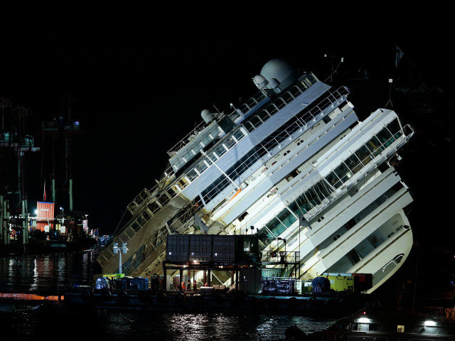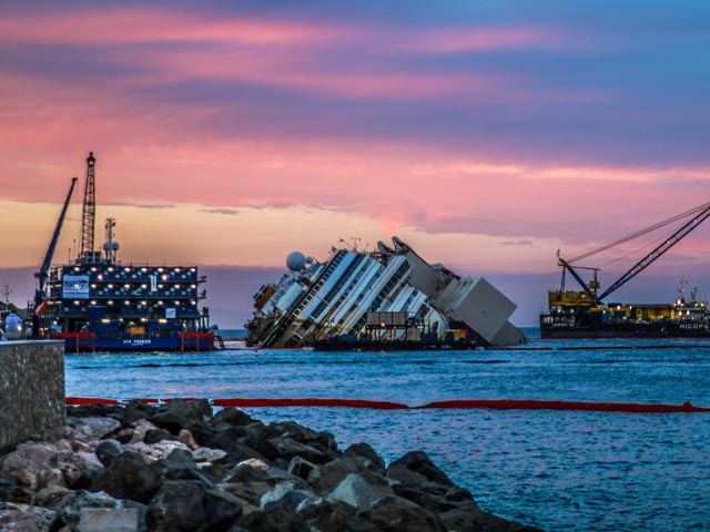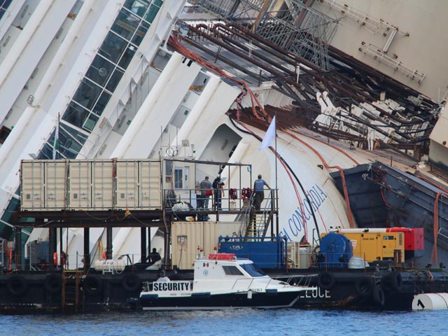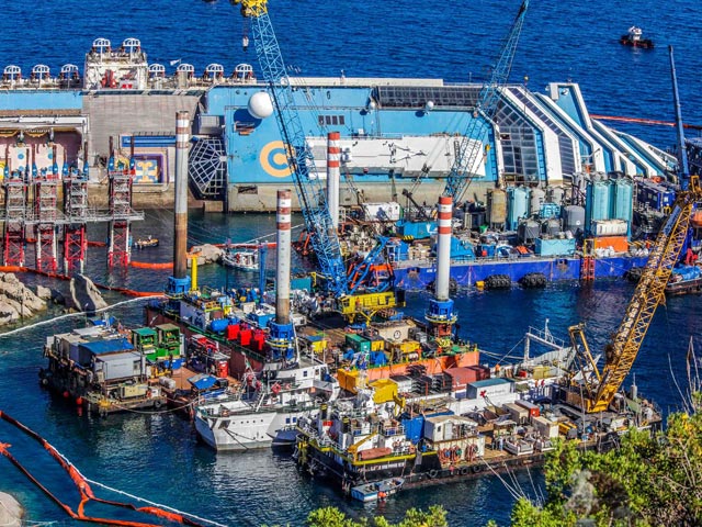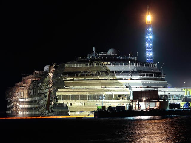 Морской гигант весом 114 тысяч тонн и длиной корпуса 300 метров поставлен на киль. Операция предусматривала разворот корпуса на 65 градусов. На поверхности оказался правый борт судна, который с момента крушения в ночь на 14 января 2012 года находился под водой.
