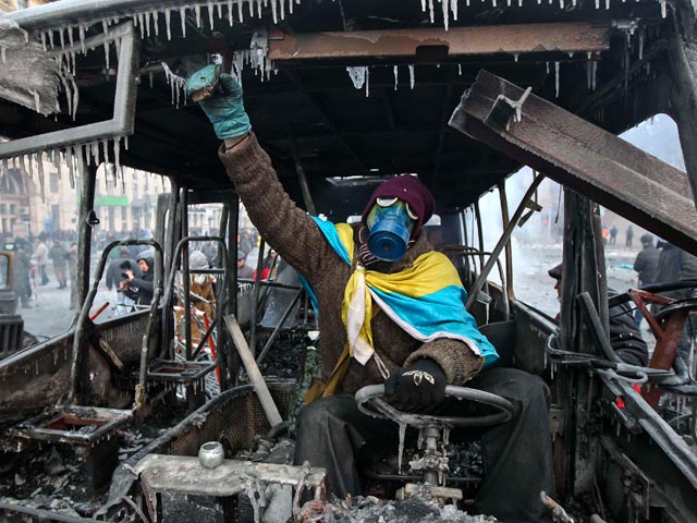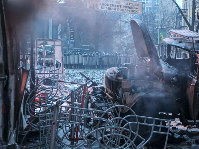 В центре Киева продолжаются начатые в воскресенье днем столкновения демонстрантов с бойцами милицейского спецподразделения "Беркут" и внутренних войск. Общее число раненых с обеих сторон уже перевалило за сотню (по данным ряда местных СМИ, общее число пострадавших уже могло достичь полутора сотен человек), сожжены четыре милицейских автобуса и два грузовика. Их обледеневшие остатки (в Киеве сейчас 10 градусов мороза) разделяют демонстрантов и силовиков, сообщает корреспондент ИТАР-ТАСС. NEWSru.ua ведет ХРОНИКУ событий.