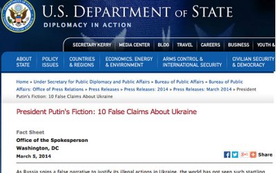 Еще до принятия санкций против угрожающих суверенитету украинского государства россиян и крымчан, США публично обвинили президента РФ Владимира Путина в искаженной интерпретации событий на Украине. Резкое заявление опубликовала пресс-служба американского правительства, посольство Штатов в РФ разместило в интернете его копию на русском языке. Россия назвала обвинение со стороны США "низкосортной пропагандой".