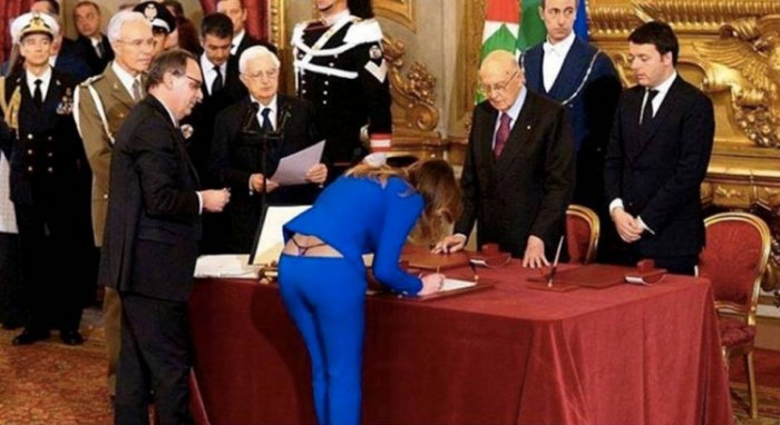 Пикантный скандал в Италии – министр конституционных реформ этой страны Мария Елена Босчи (Maria Elena Boschi), подписывая какой-то важный документ, продемонстрировала очаровательные трусики-стринги, которые оказались на виду, когда госпожа министр наклонилась над столом.