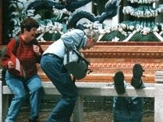 На следующем снимке позирующие люди успели заметить чрезвычайную ситуацию и даже отреагировать на нее: их спутник рухнул со скамейки спиной назад, и на снимке видны лишь ноги.