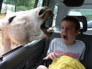 Как воспринял участник этого снимка свое падение, сказать нельзя, поскольку его лица на фотографии не видно. Но вот мальчик, которого пожелал поприветствовать кто-то из забавных животных в природном парке, совсем не обрадовался.