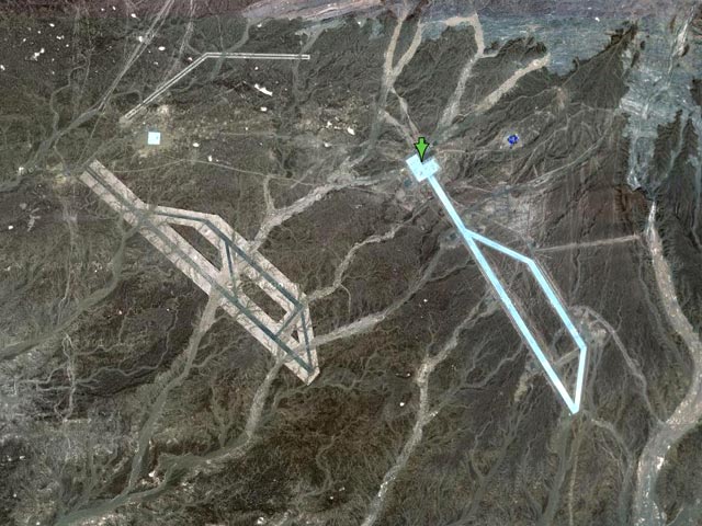 Впрочем, в пустыне Гоби есть и более понятные объекты: так, на одном из снимков видно нечто, напоминающее аэродром, оснащенный взлетно-посадочной полосой - правда, насыщенного голубого цвета.