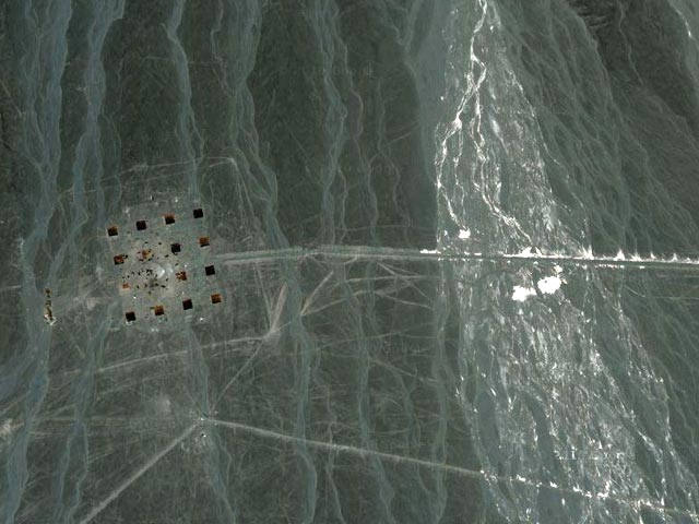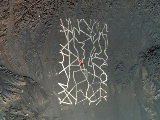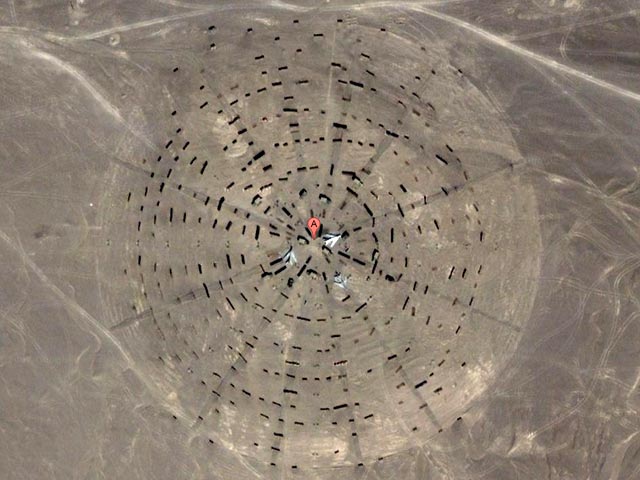Интригу подпитывает то, что практически невозможно сказать, из чего сделаны запечатленные со спутника сооружения - быть может, они вообще лишь нарисованы или вырыты в пустыне. Как бы то ни было, при увеличении на некоторых фотографиях можно разглядеть самолеты и сожженные грузовики, что наталкивает на мысль о военном полигоне. На одном из снимков видны такие повреждения структуры нанесенных линий, которые могут свидетельствовать о том, что они предназначены для учебной стрельбы с военными целями, отмечают эксперты.