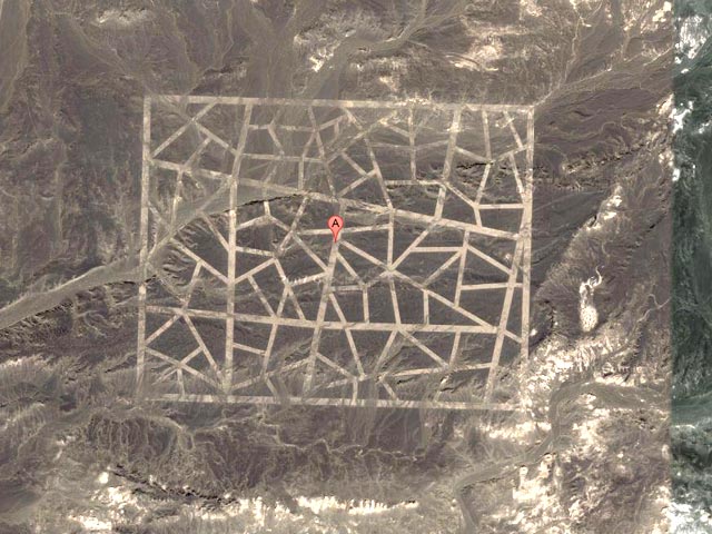 Первый из обнаруженных объектов - один из самых загадочных. Это большое количество гигантских полос, похожих по отблеску на металлические. Переплетаясь, они образуют замысловатый узор посреди пустыни, пишет сайт Gizmodo. Возможно, эта конструкция специально сделана так, чтобы ее было видно с космической орбиты. Похожая "сетка" обнаружена и в другом месте.