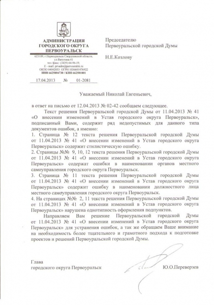 Откуда такой вывод? Он очевиден: интернет-зависимость начала сказываться на служебных делах. Ну а как же иначе расценить документ, который поступил в Первоуральскую городскую Думу в ответ на решение депутатов о внесении изменений в Устав городского округа Первоуральск? Подписывать решение Переверзеву категорически не хочется. Ведь введение в Первоуральске поста сити-менеджера расценивается главой как смертный приговор. Не подписывать – чревато судебным иском (один, как известно, уже подан). Видимо поэтому выбрана тактика «тянем время любыми путями».
