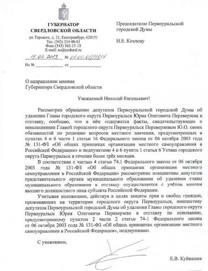 Куйвашев за отставку мэра Первоуральска Затянувшийся политический конфликт в Первоуральске близок к разрешению. Губернатор Свердловской области Евгений Куйвашев, который долгое время не комментировал политический конфликт в Первоуральске, все-таки поддержал инициативу народных избранников. За три дня до заседания депутатов гордумы, главным вопросом на котором станет импичмент действующего главы города Юрия Переверзева, губернатор одобрил решение депутатов отправить главу Первоуральска в отставку за неудовлетворительную работу. Все говорит о том, что увольнение неизбежно, но мэр сбежал в отпуск.