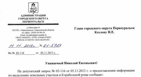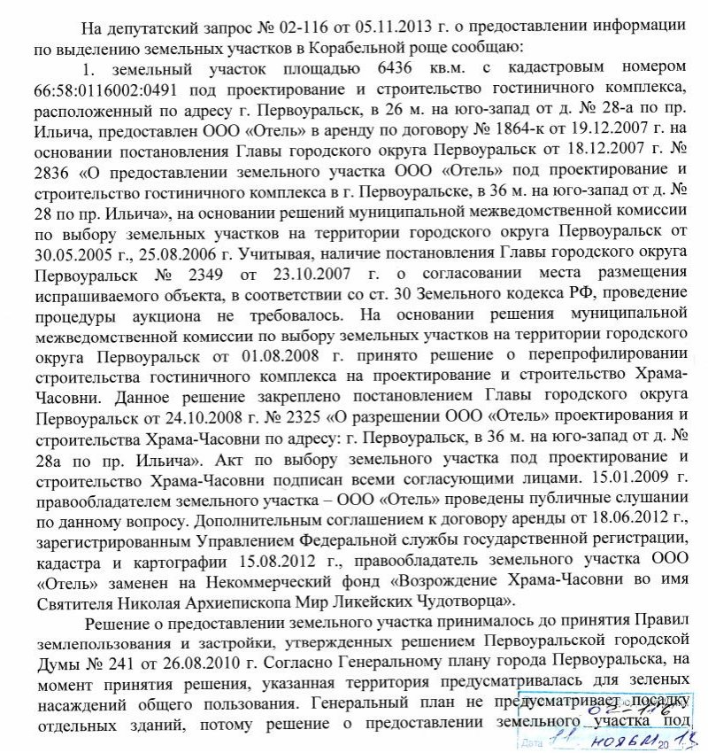 Из ответа зам. главы А. Слабуки также видно, что Администрация не проводила публичных слушаний, а значит, данный земельный участок не был переведен в категорию земель древесно-кустарниковая растительность, как писал на сайте бывший глава города Юрий Переверзев. Получается человек Юрий Олегович пишет неправду, тем самым вводит в заблуждение жителей Первоуральска?