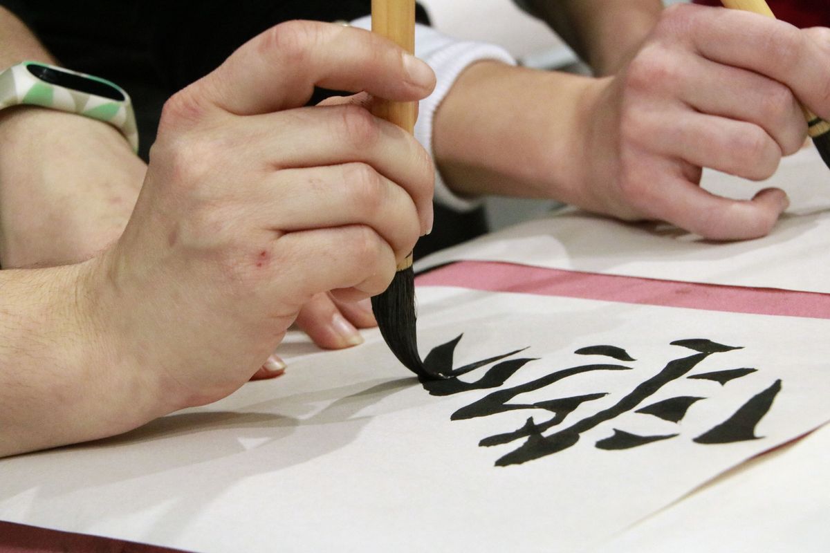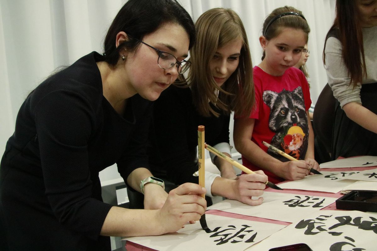 — Откидная. Три точки. Откидная влево. Крышечка. Внутри — сердце, — мастер каллиграфии Мария Марченко учит первоуральцев писать японский иероглиф, обозначающий «любовь».