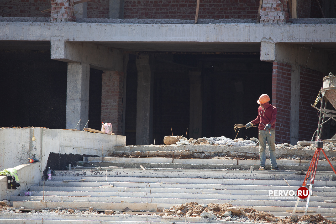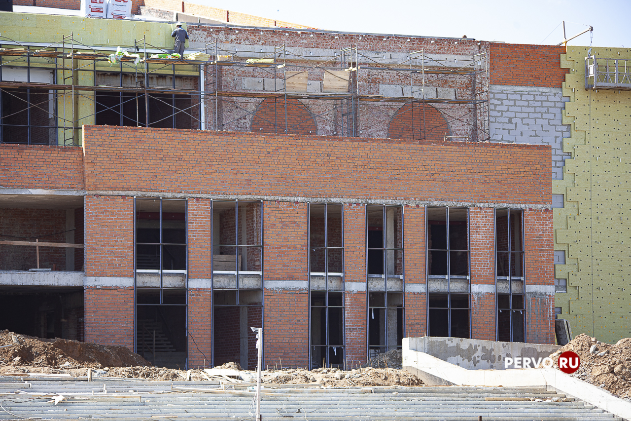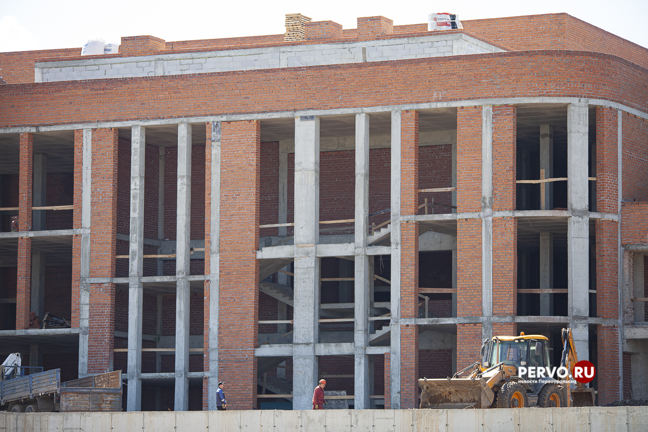 В Первоуральске идёт строительство Дворца водных видов спорта. Рабочие уже построили второе здание, производят утепление части фасада, делают лестничные спуски.