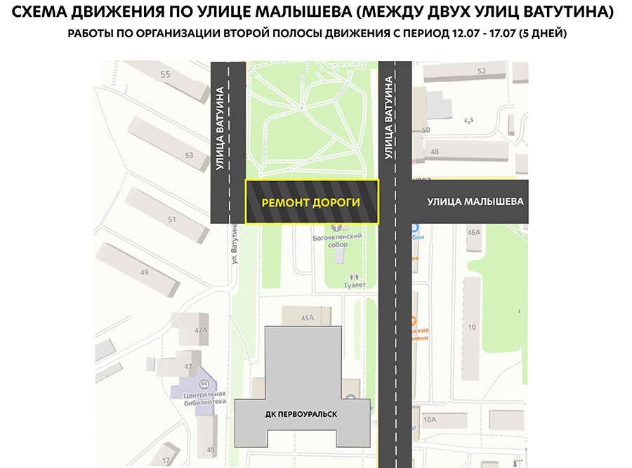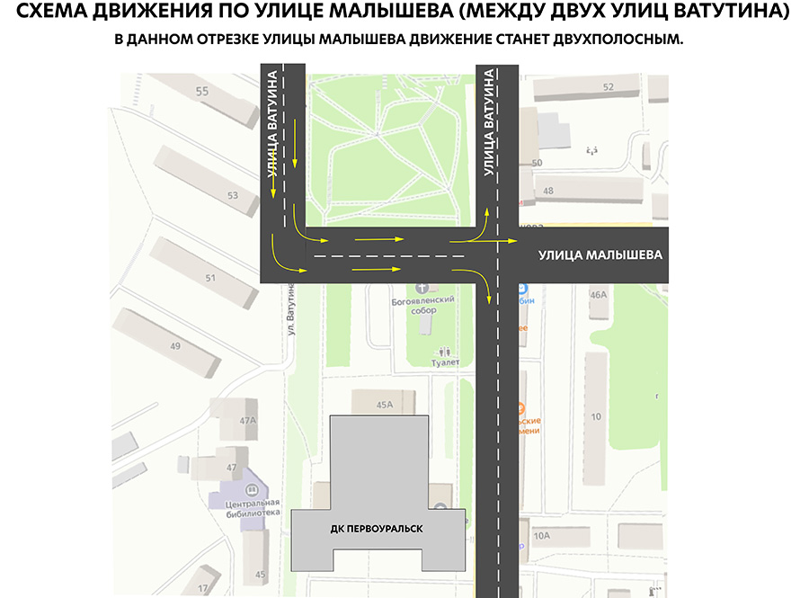 Перешеек на Малышева будет двухполосным. Этого, к слову, долго ждали первоуральцы. Одна полоса пойдет в сторону площади, вверх, вторая – прямо по Малышева и вниз по улице Ватутина. – Это разгрузит транспортный поток в момент, когда проспект Ильича вновь перекроют.