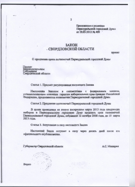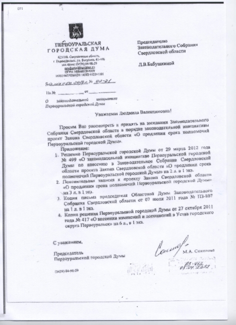 Первоуральская городская дума вновь обратилась к Законодательному собранию Свердловской области с просьбой продлить срок её полномочий на март 2013 года. Решение об этом было принято 29 марта. В ближайшее время все необходимые документы будут направлены в Заксобрание.