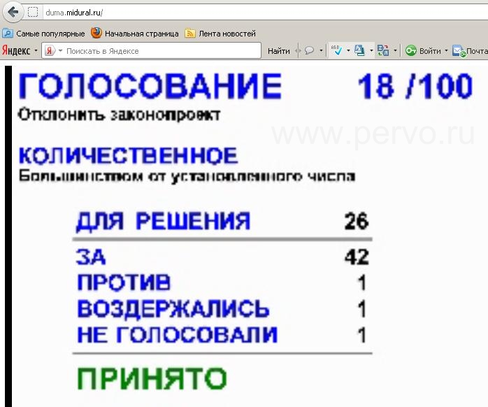 Сегодня, 15 мая 2012 года, Депутаты Законодательного собрания Свердловской области отказались продлять полномочия депутатов городской Думы Первоуральска, избранных весной 2008 года. За отклонение проекта закона в первом чтении народные избранники проголосовали практически единогласно: ЗА 41 человек, ПРОТИВ 1.