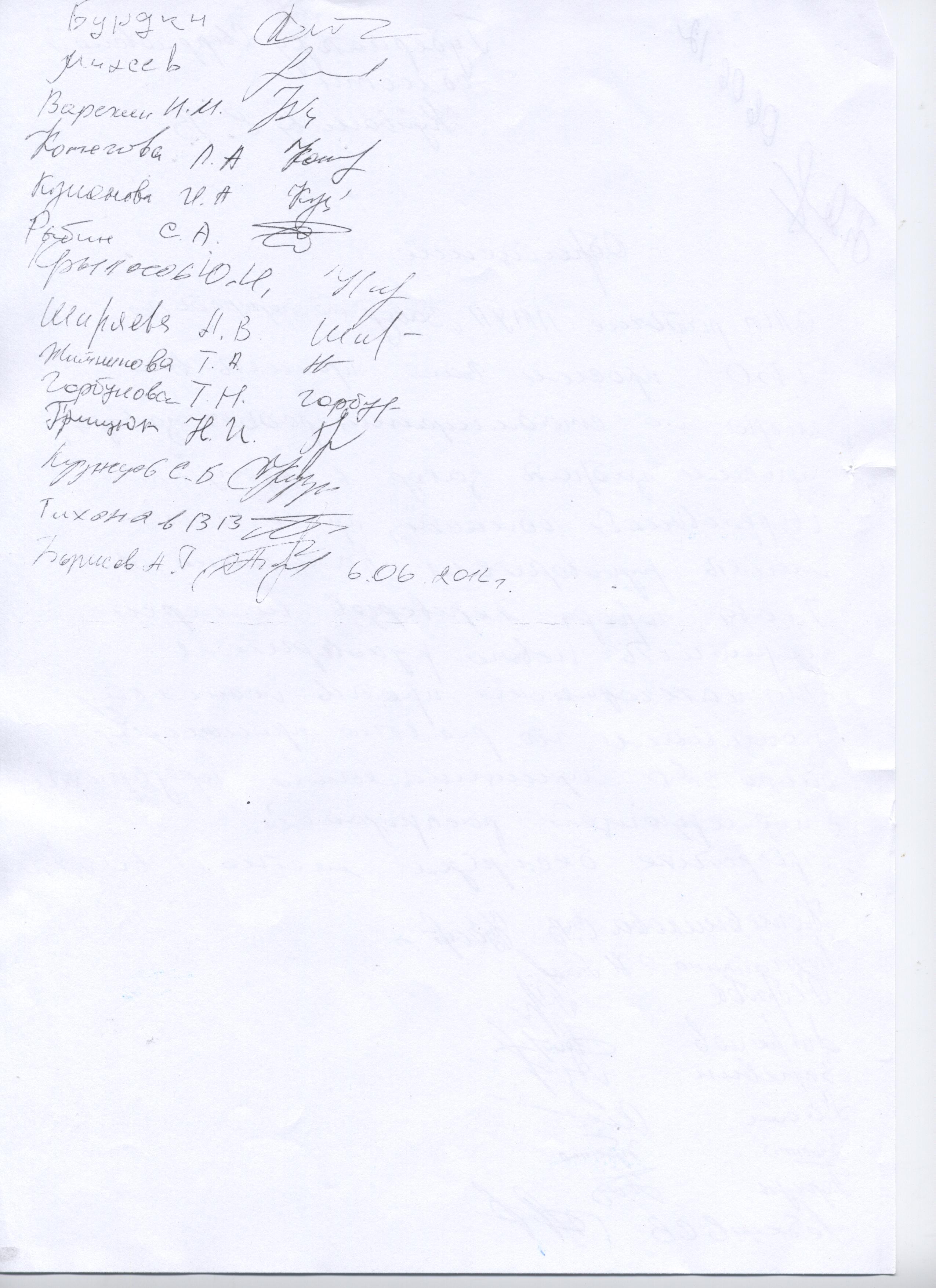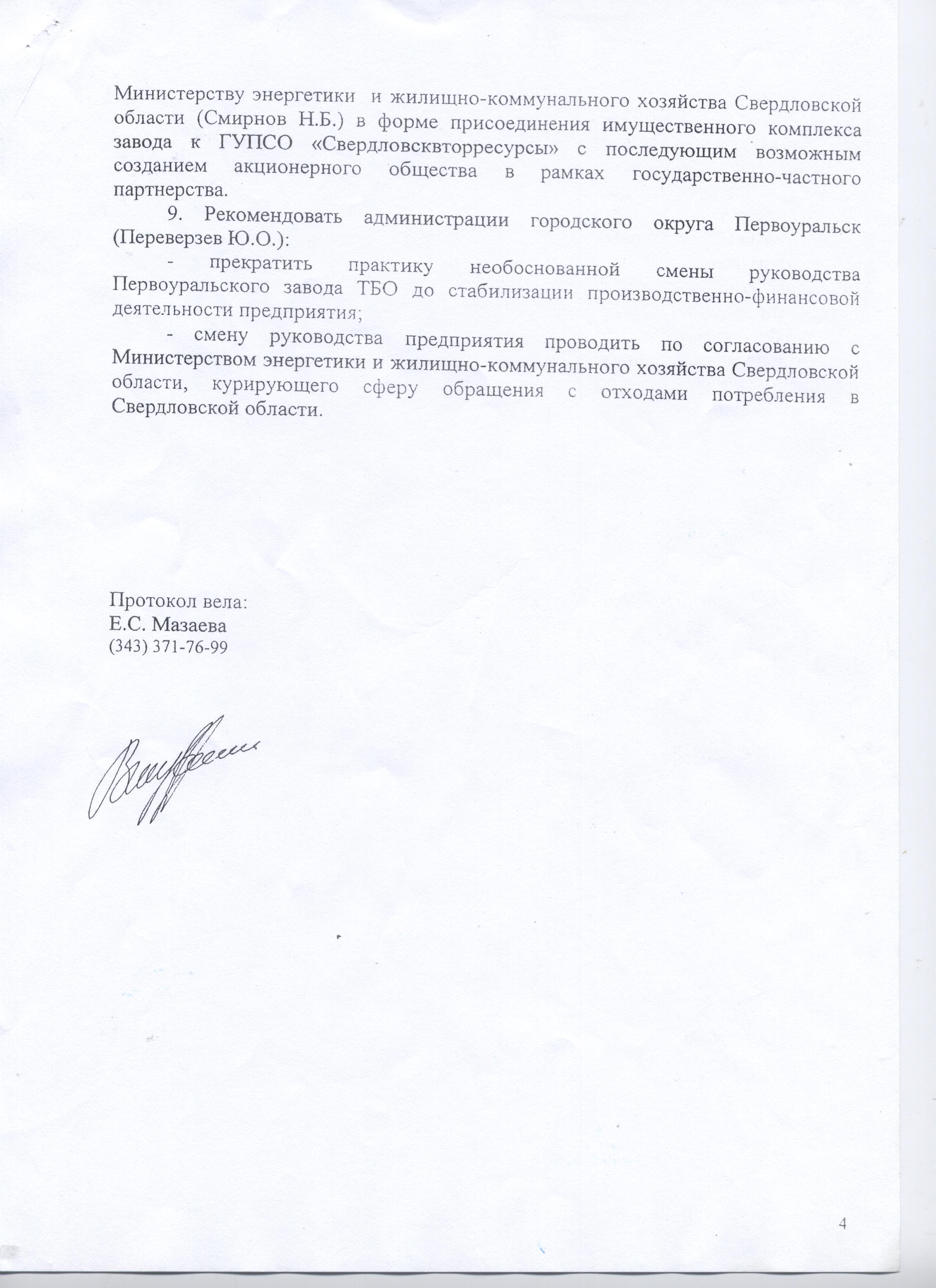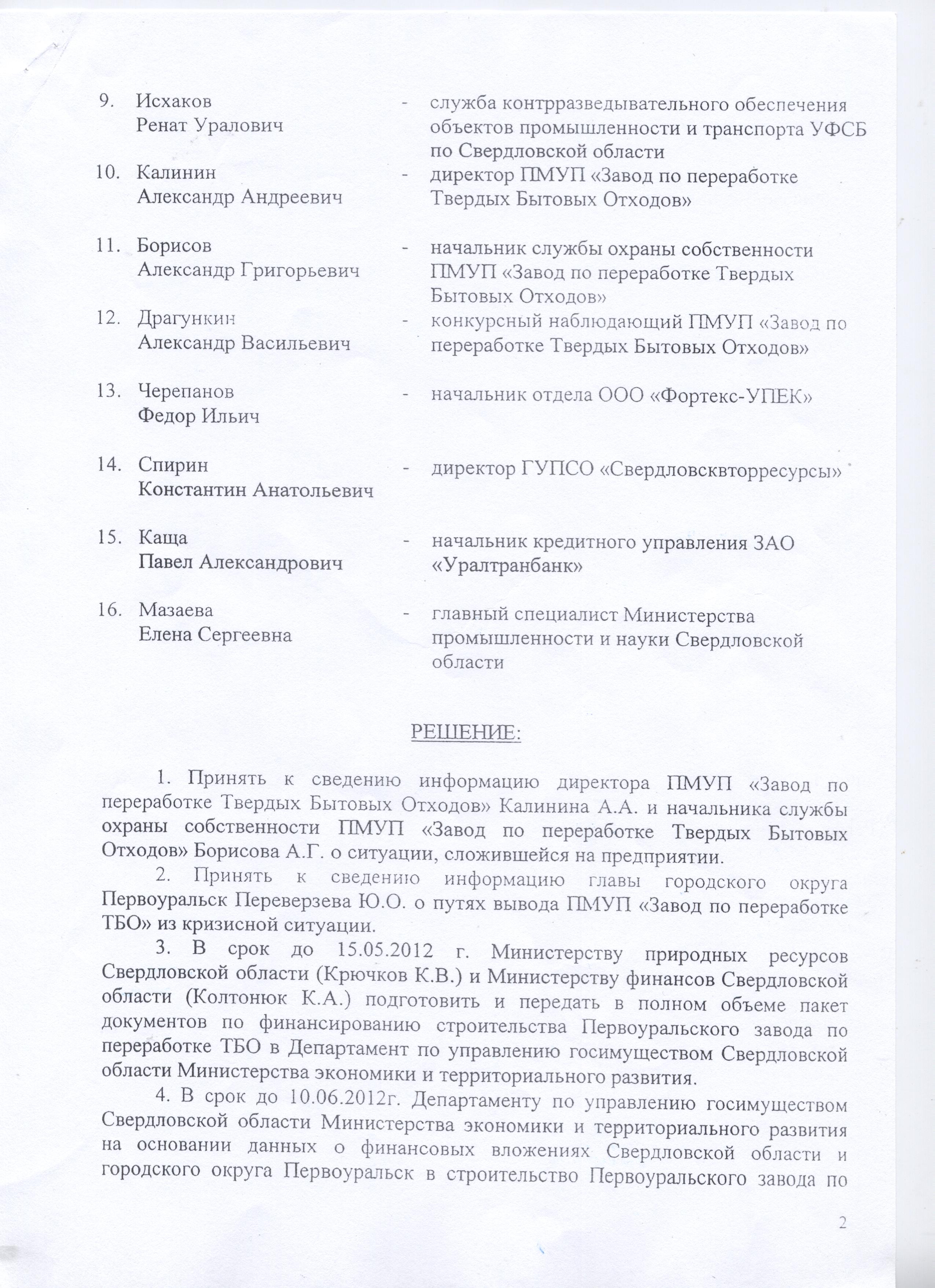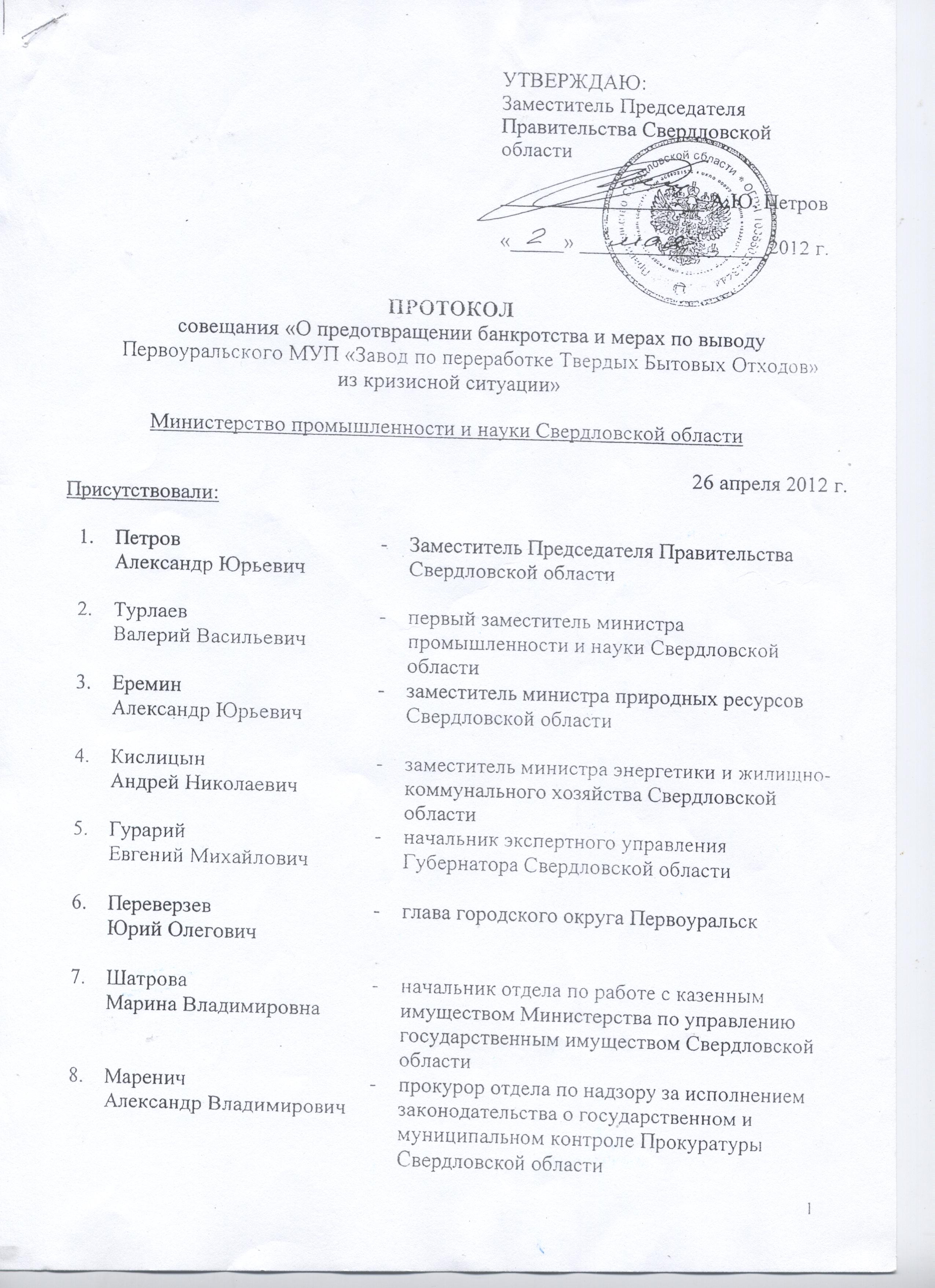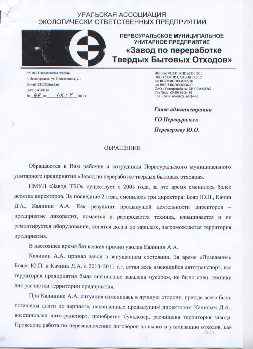 Письмо родилось 6 июня 2012, когда распоряжением мэра на завод был назначен новый директор Сергей Пархацкий. К слову сказать, на работу он не спешил. Кроме завода существует еще и офис, где сидят управленцы. К 8-ми утра, как положено, на работу приехал Александр Калинин. На тот момент распоряжение о его увольнении он на руки не получил, как не получил и расчет. Для разъяснения ситуации работникам, а в период работы Калинина число их увеличилось до 90 человек, в офис привезли и тех, кто непосредственно перебирает и сортирует городской мусор. Правда, во время больничного А. Калинина в бытность и.о. Пархацкого некоторые уволились по причине невыплаты им зарплаты. В итоге в офис приехала только одна смена из 35 человек. Люди ждали появления Пархацкого, а тот выжидал их отъезда, видимо опасаясь очной встречи. Рабочий день никто не отменял – автобус отправился на завод. Буквально в считанные минуты вновь назначенный Сергей Пархацкий подтянулся. Представлять 10-го по счету директора взялся Сергей Куртюков – зам.главы Первоуральска по Управлению ЖКХ. Выступал Куртюков, Пархацкий сидел молча. На вопрос, почему местная власть меняет им директора вопреки рекомендации власти Областной, Куртюков ответил, что в глаза такой бумаги не видел. Между тем, в мэрию из области она пришла уже около двух месяцев назад. После того, как состоялось совещание у вице-премьера Правительства А.Ю.Петрова. Ниже приведен протокол.